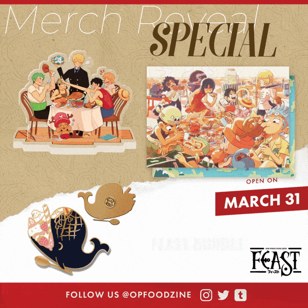Feast: One Piece Food Zine is an artbook project made up of over 40 creatives from around the world (including artists, writers, graphic designers and our chef) to create a perfect bound book of 140+ pages of full coloured content and a line of designed merchandise. The project is dedicated to celebrating the many cuisines of the One Piece universe and the role of food as a symbol of celebration, friendship and multiculturalism!
